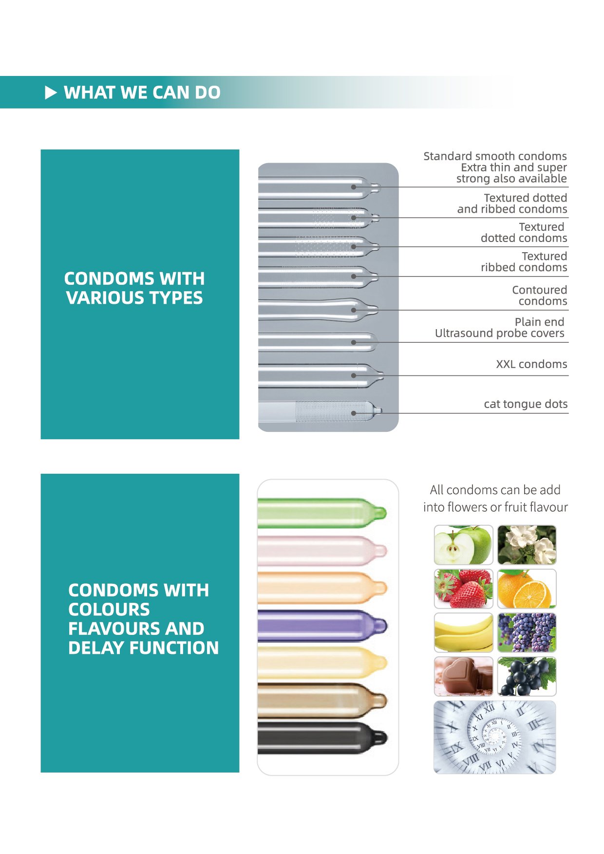 According to worldwide consumers’ demand, we provide variestypes, size and functions of condoms. For your lable customized, please contact with us.